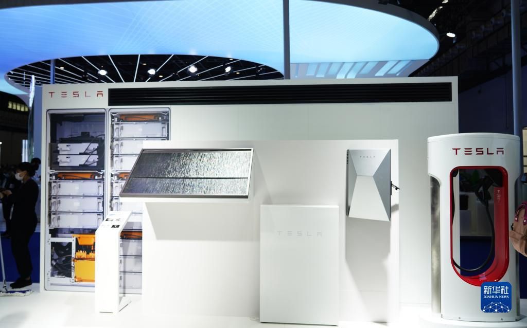 这是特斯拉的全方位能源供应展区,所展出产品包括太阳能屋顶、家用储能电池及充电桩(4月11日摄)。新华社