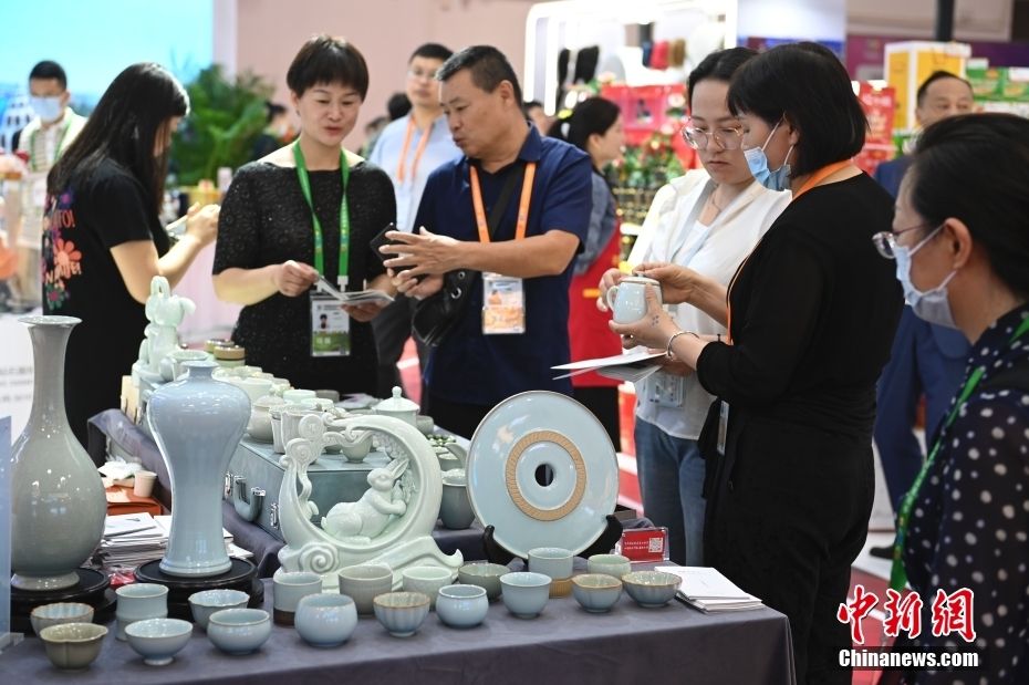 4月11日,海南海口,第三届中国国际消费品博览会吸引观众前来参观。图为观众在河南展区参观选购汝瓷。中新网