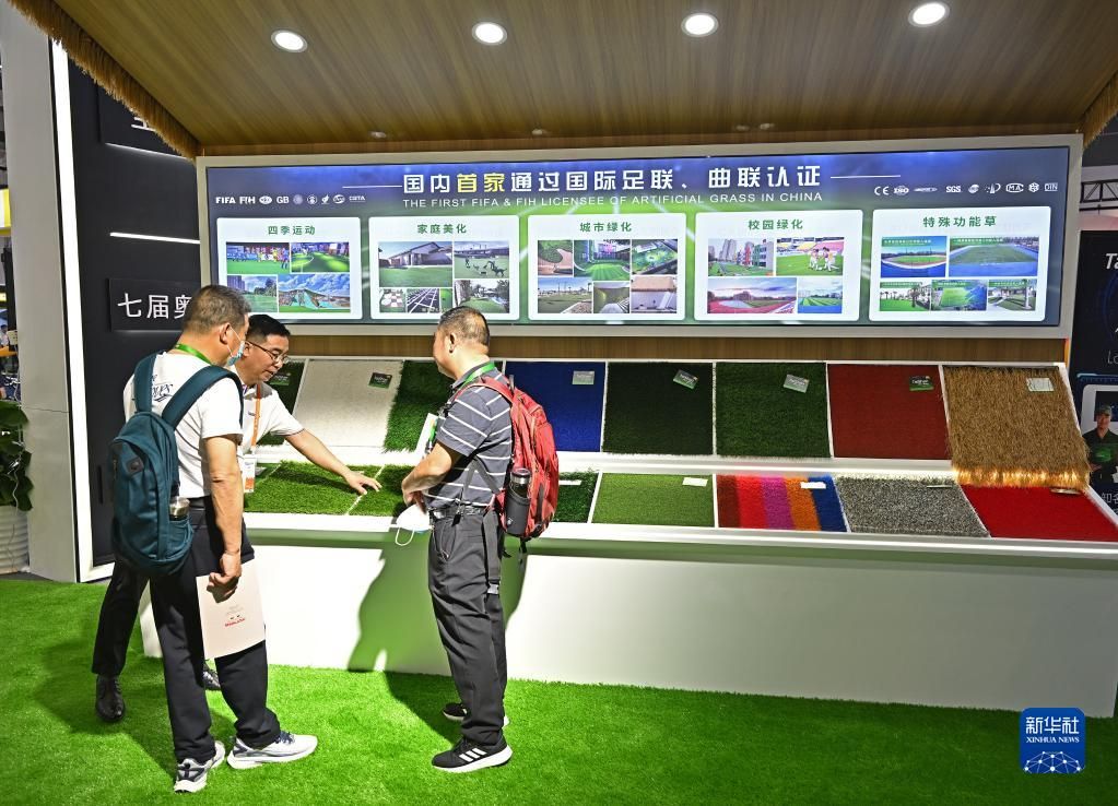 4月11日,在消博会的泰山体育展台,工作人员向参观者介绍可以释放负氧离子的人造草坪。新华社