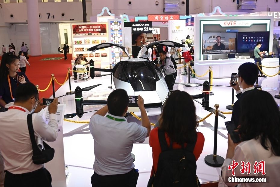 4月11日,海南海口,第三届中国国际消费品博览会吸引观众前来参观。图为观众在广东展区参观拍摄小鹏汇天自主研发制造的“飞行汽车”。中新网
