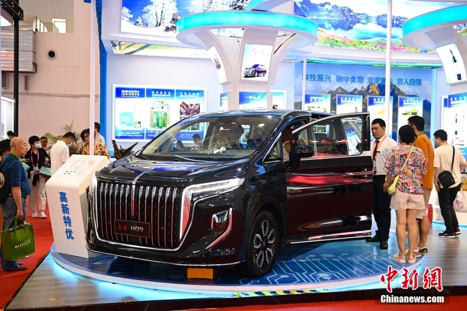 4月11日,海南海口,第三届中国国际消费品博览会吸引观众前来参观。图为观众在吉林展区参观红旗MPV汽车。中新网