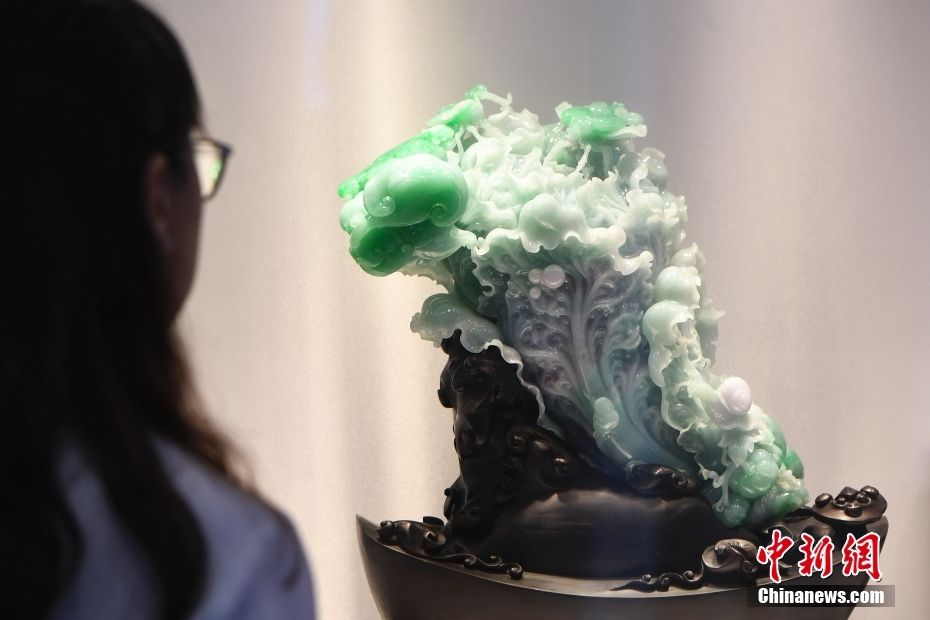 4月11日,海南海口,第三届中国国际消费品博览会吸引观众前来参观。图为参观者在七彩云南展区观看展出的翡翠白菜。中新网