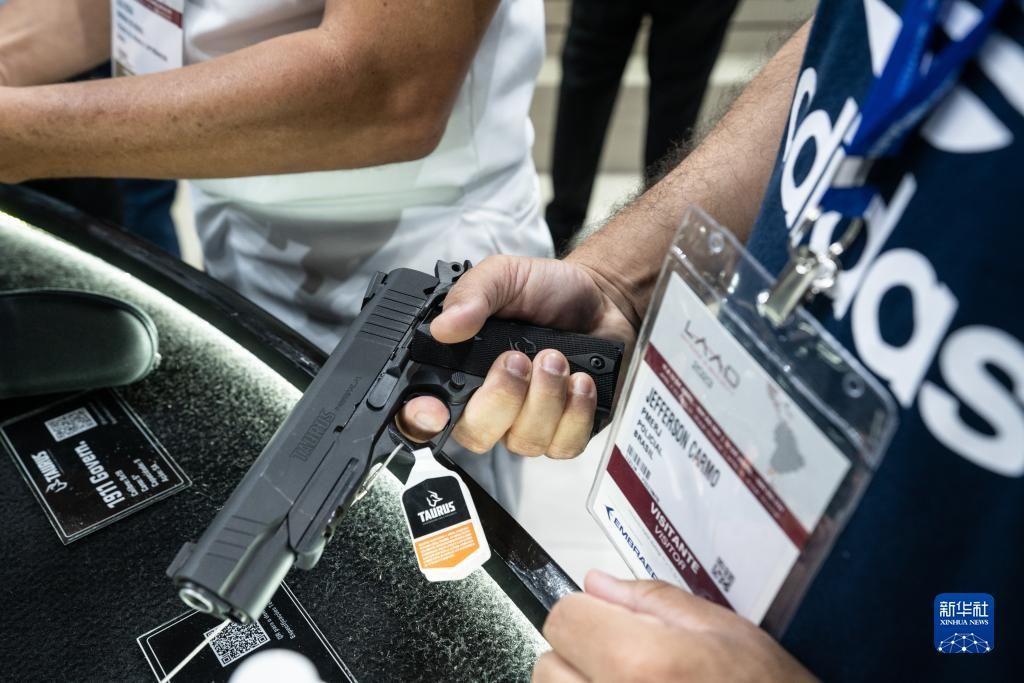 参观者在巴西防务展上体验一款手枪。新华社