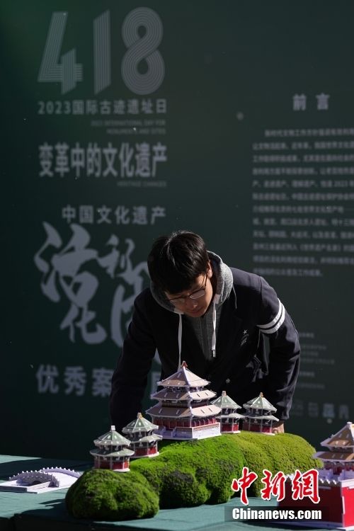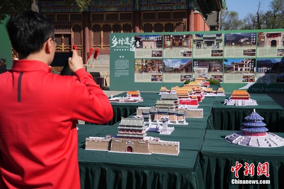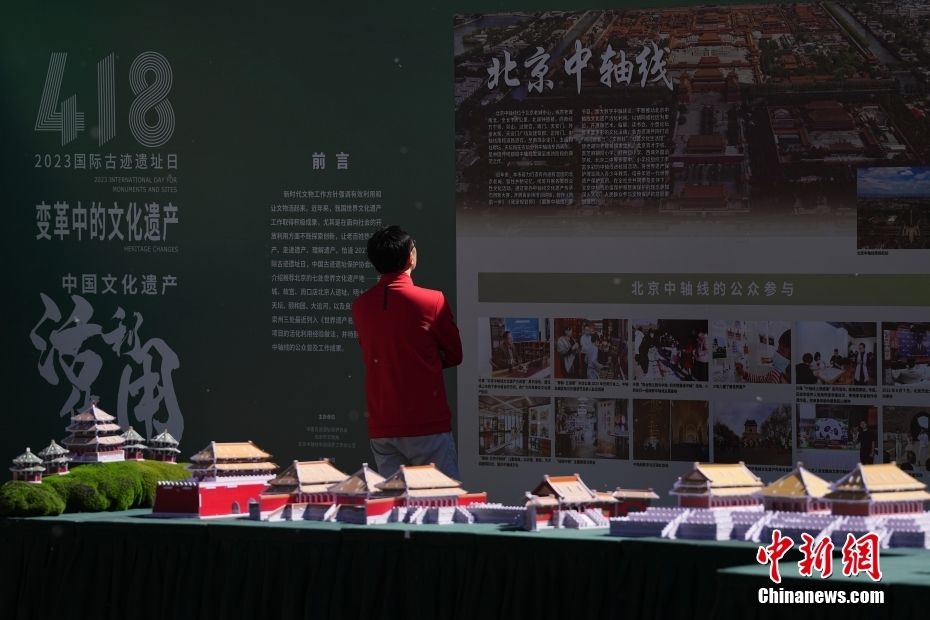 4月18日是第41个“国际古迹遗址日”,今年的活动主题为“变革中的文化遗产”。当日,在北京圆明园遗址公园内举办国际古迹遗址日中国主场活动,其他多省市也纷纷开展相关主题活动,通过多种形式宣讲,加强对文化遗产的保护与传承。图为在北京圆明园遗址公园内,与会者拍摄现场展示的北京中轴线建筑群模型。中新网