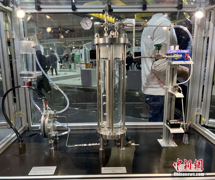 18日,参展机构展示的从水制氢气到发电过程模型。中新网