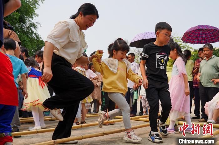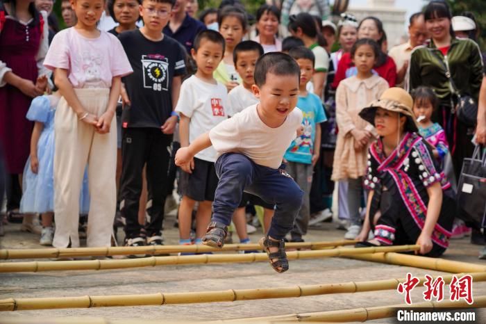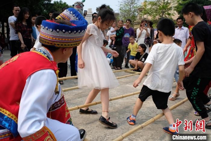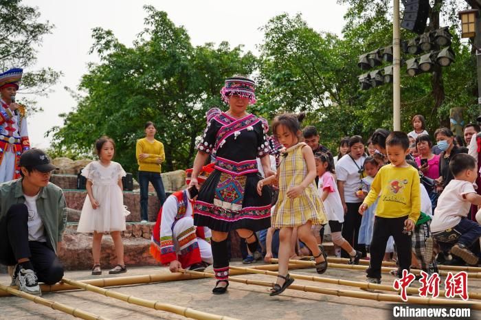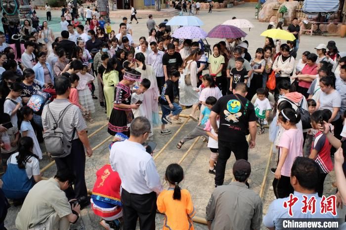“竹竿舞”吸引众多游客围观体验。中新网