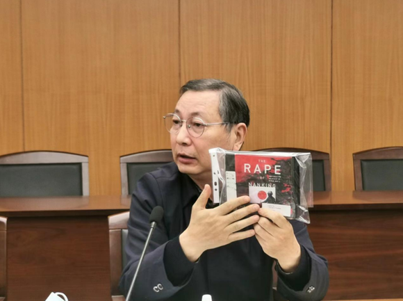 鲁照宁展示由美国音像公司发行的一套七张光盘的张纯如著作《南京浩劫:二战中被遗忘的大屠杀》。中新网