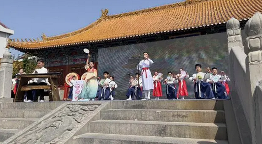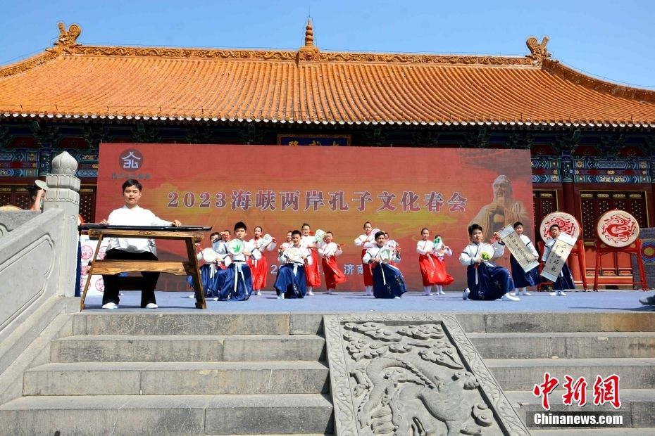 4月27日,小学生在山东济南府学文庙表演。当日,以“传承经典 筑梦未来”为主题的2023年海峡两岸孔子文化春会在济南启动,以视频连线形式在昆山、台北设置分会场。中新网