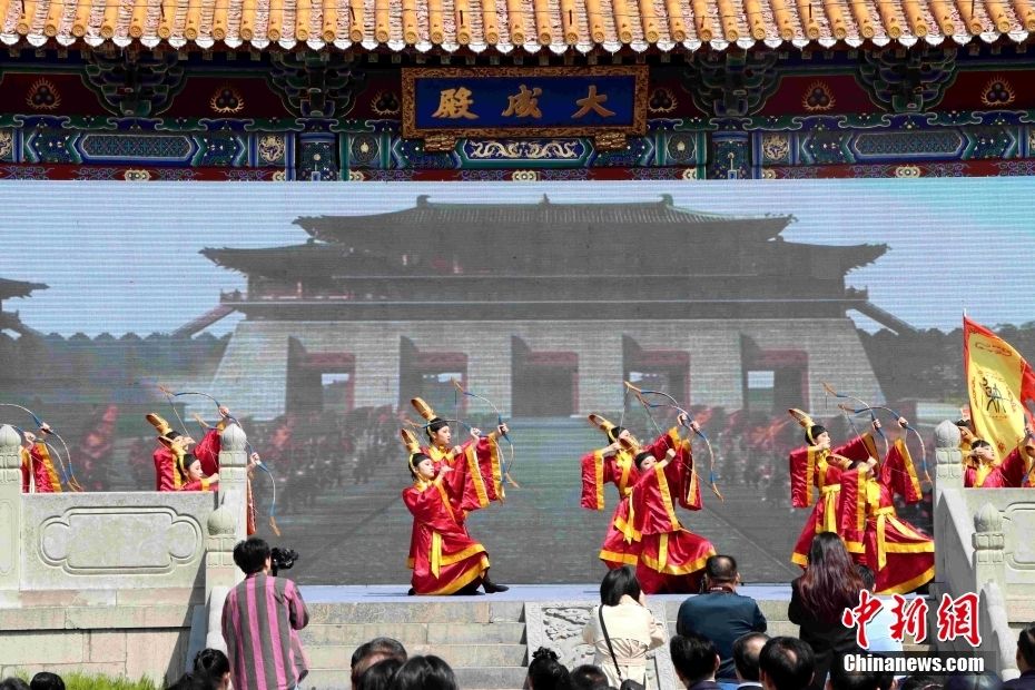 4月27日,小学生在山东济南府学文庙表演射艺节目。中新网