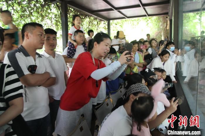 “五一”假期,中国多地动物园的大熊猫馆客流“火爆”,憨态可掬的“国宝”大熊猫吸引众多游客前往观赏。许多人为了看到明星熊猫甚至排队数小时,成都大熊猫繁育研究基地更是一票难求。图为4月30日,海南热带野生动植物园内,游客拍摄熊猫留念。中新网