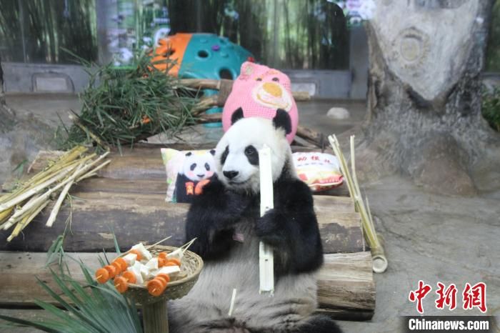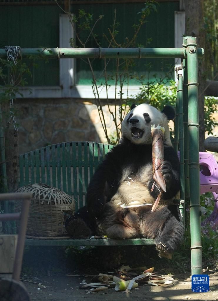 4月30日,在海南热带野生动植物园,熊猫“贡贡”正在享受“大餐”。 中新网