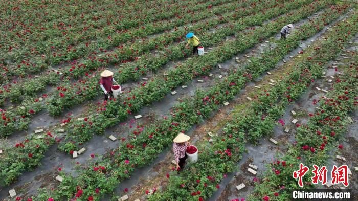玫瑰园中的村民忙着采摘鲜花。中新网