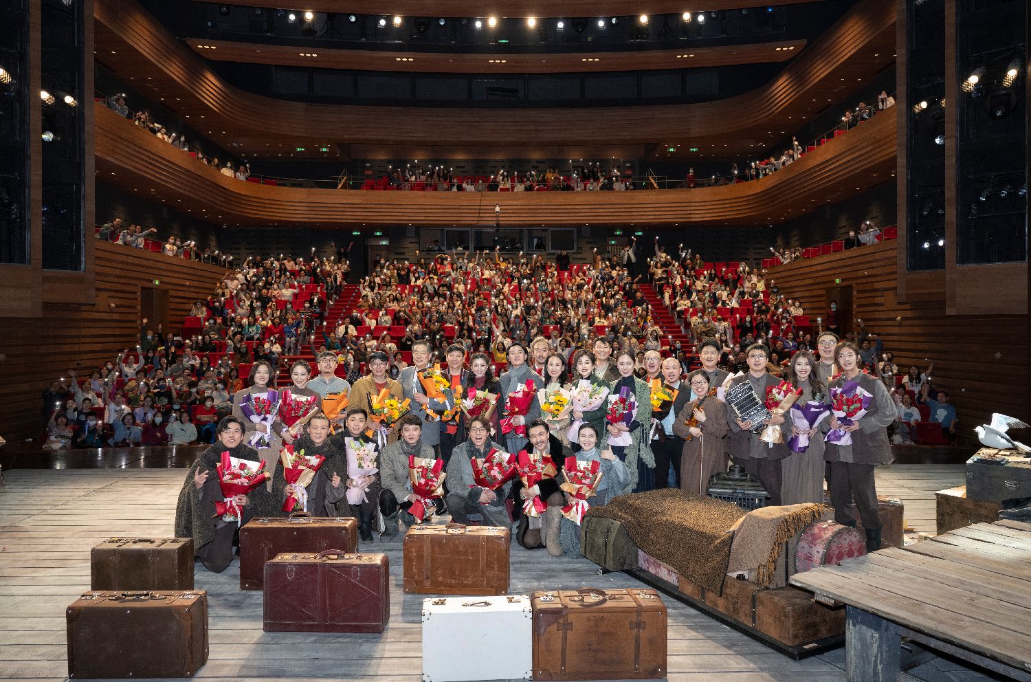 当地时间5月1日,北京人艺新排话剧《海鸥》在曹禺剧场成功首演。《海鸥》是契诃夫最著名的作品之一,在全世界享有盛誉。此次,中国导演濮存昕用上了40年舞台创作的积累,将艺术经验、总结与思考都放进了这部作品当中,希望让观众看到属于北京人艺的全新契诃夫。成功首演后,濮存昕回顾历时数月的创作过程时说:“契诃夫的作品是世界经典,我们解读他的作品像爬一座山。到达顶峰不易,有观众的陪伴,我们继续努力。”图为5月1日,《海鸥》在曹禺剧场成功首演后,全体主创与现场观众合影。 史春阳 摄