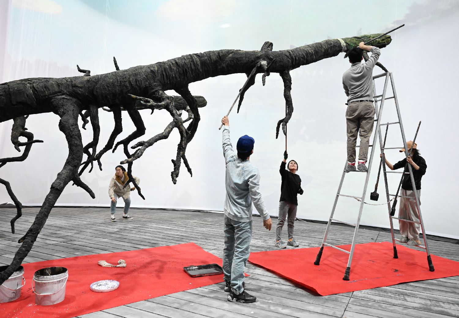 4月19日,《海鸥》的布景在北京人艺曹禺剧场搭建,舞美队为大树涂漆做旧。史春阳 摄