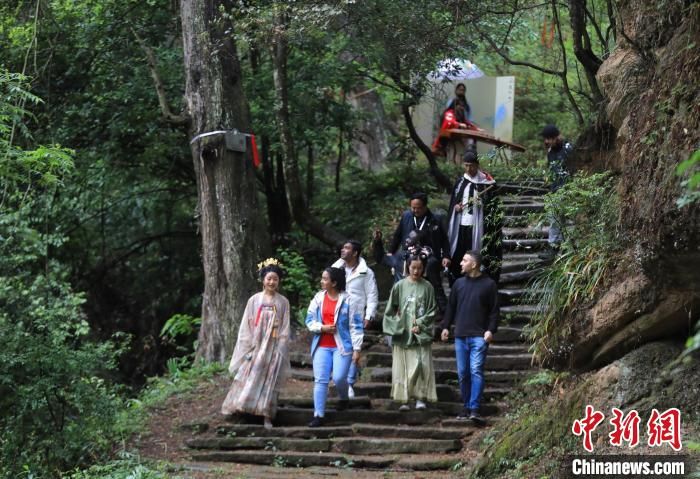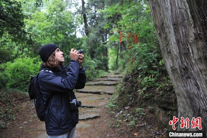 一位国际媒体人在蜀道上拍摄古柏。中新网