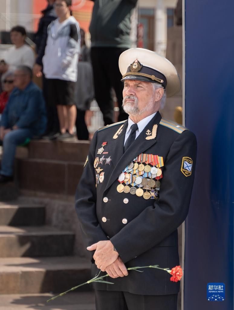 5月9日,在俄罗斯符拉迪沃斯托克,一位老兵参加胜利日庆祝活动。新华社