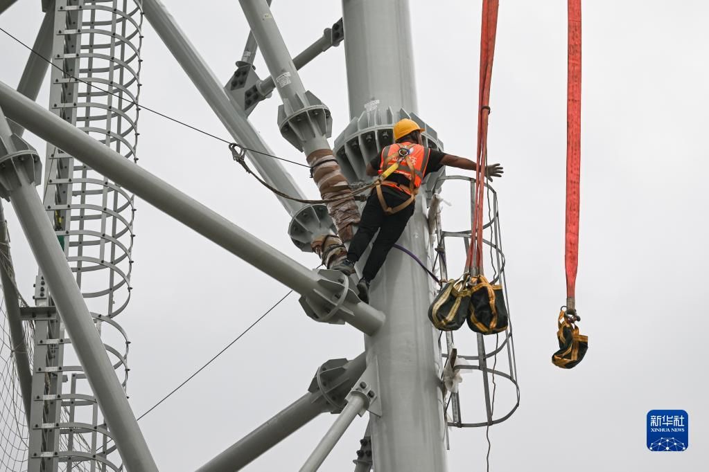 目前,海南商业航天发射场1号、2号两个工位正在加速建设,加注供气系统、智慧发射场系统已全面展开设备生产加工、软件研制开发,电网、路网等配套设施以及软实力建设也在并行加速推进。各项建设进度符合预期计划,预计可确保2024年二季度按期首飞。图为5月13日,工人在位于海南省文昌市的海南商业航天发射场1号工位施工。新华社