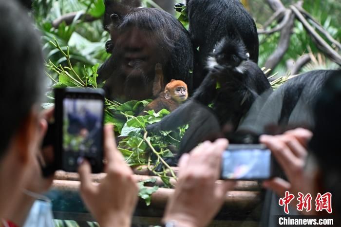 今年以来,广州长隆野生动物世界成功繁育两只雄性黑叶猴,黑叶猴宝宝“想你”出生于3月30日,黑叶猴宝宝“花园”出生于5月5日。两只猴宝宝于5月14日正式亮相与游客见面。图为游客拍摄黑叶猴宝宝“花园”。中新网