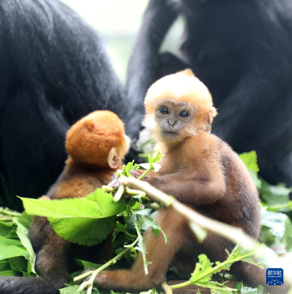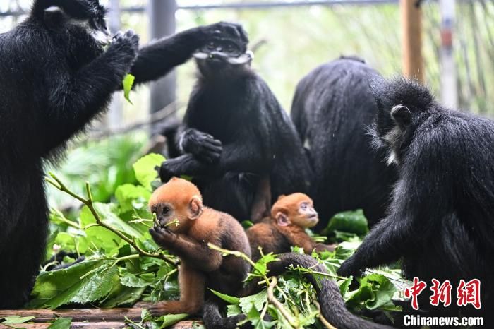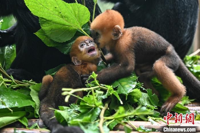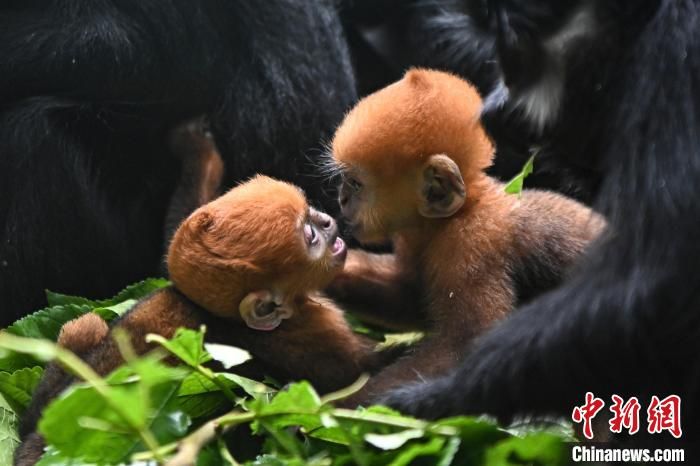 黑叶猴是中国国家一级重点保护动物,也是世界上最濒危的灵长类动物之一,黑叶猴小幼崽刚出生时尾部以上都是金黄色,整体变黑需要6个月至7个月。图为黑叶猴宝宝“想你”“花园”与家族成员一起生活。中新网