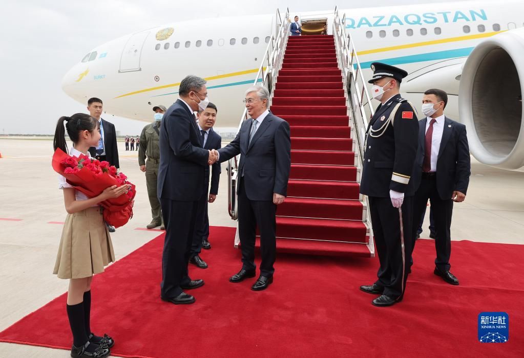 17日下午至18日上午,哈萨克斯坦总统托卡耶夫、塔吉克斯坦总统拉赫蒙、吉尔吉斯斯坦总统扎帕罗夫、乌兹别克斯坦总统米尔济约耶夫、土库曼斯坦总统别尔德穆哈梅多夫先后抵达中国陕西省西安市。当地民众以热情的腰鼓、欢快的秧歌等民间艺术表演欢迎中亚国家贵宾到来。图为5月17日下午,出席中国-中亚峰会的哈萨克斯坦总统托卡耶夫抵达陕西省西安市。托卡耶夫是首位抵达西安的与会中亚国家元首。新华社
