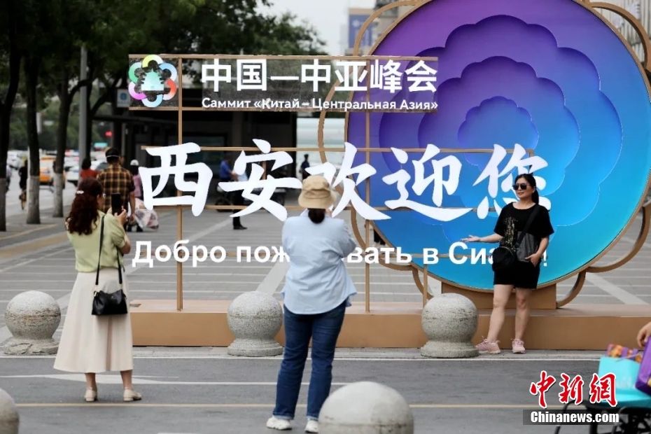 大美西安,迎峰会召开。图为5月17日,陕西西安,游客在中国-中亚峰会主题装置前拍照留影。中新网