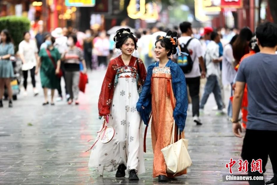 5月17日,陕西西安一老街,游客身着汉服游玩。中新网