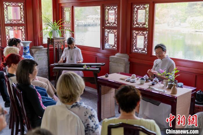 德国柏林中国文化中心21日在柏林世界公园中国园—“得月园”石舫,联手桂露山房茶室合作举办了首场“茶和天下·雅集”活动,近二十名德国嘉宾应邀出席,共同观赏茶艺展示,听琴、品茗、品尝茶点,沉浸式体验中国传统茶文化和雅文化。图为表演茶与古琴的对话。 中新网/柏林中国文化中心供图。