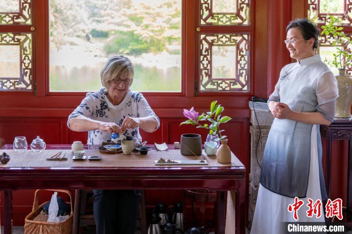柏林世界公园园长布赫女士在茶艺师的指导下体验白茶的盖碗冲泡法。中新网/柏林中国文化中心供图。