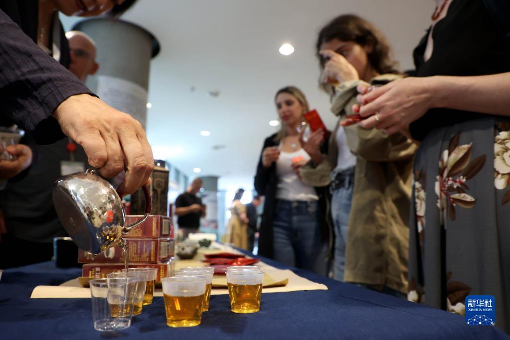 5月21日,人们在以色列特拉维夫中国文化中心“茶和天下·雅集——美在郑州”推广活动上品茶。新华社