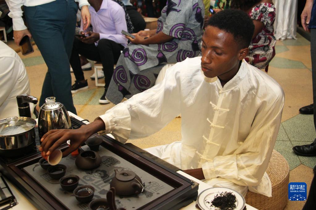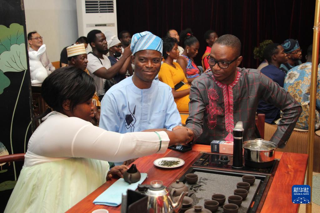 5月20日,人们在贝宁科托努贝宁中国文化中心“茶和天下·雅集——青岛有礼”文化交流活动上品茶。新华社