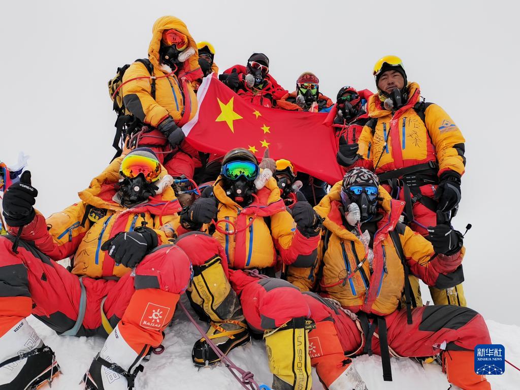 5月23日12时30分许,2023年中国珠峰科考13名登顶队员成功登顶地球之巅珠穆朗玛峰。之后,他们将完成峰顶雪冰样品采集等重要科考任务。这是中国珠峰科考继2022年之后,再次突破8000米以上海拔高度。图为5月23日,科考登顶队员在珠峰峰顶展示中国国旗。新华社