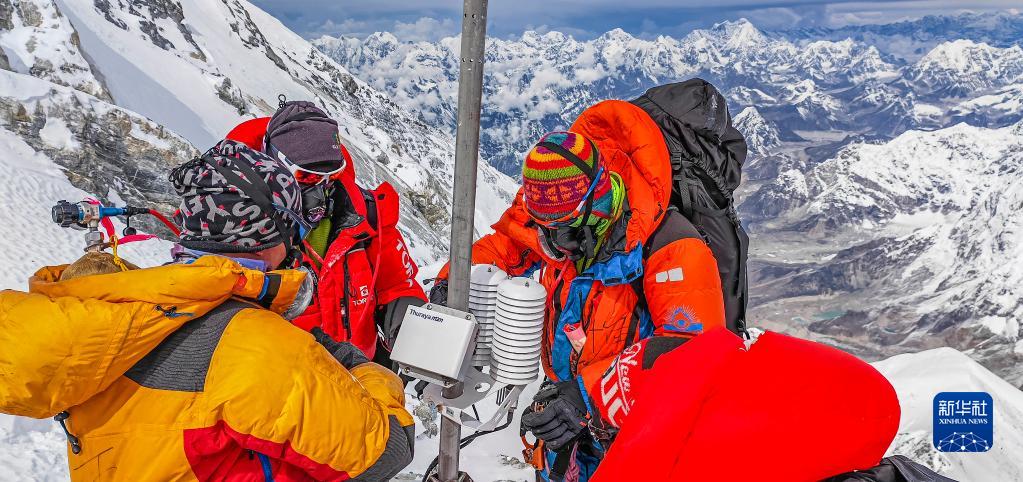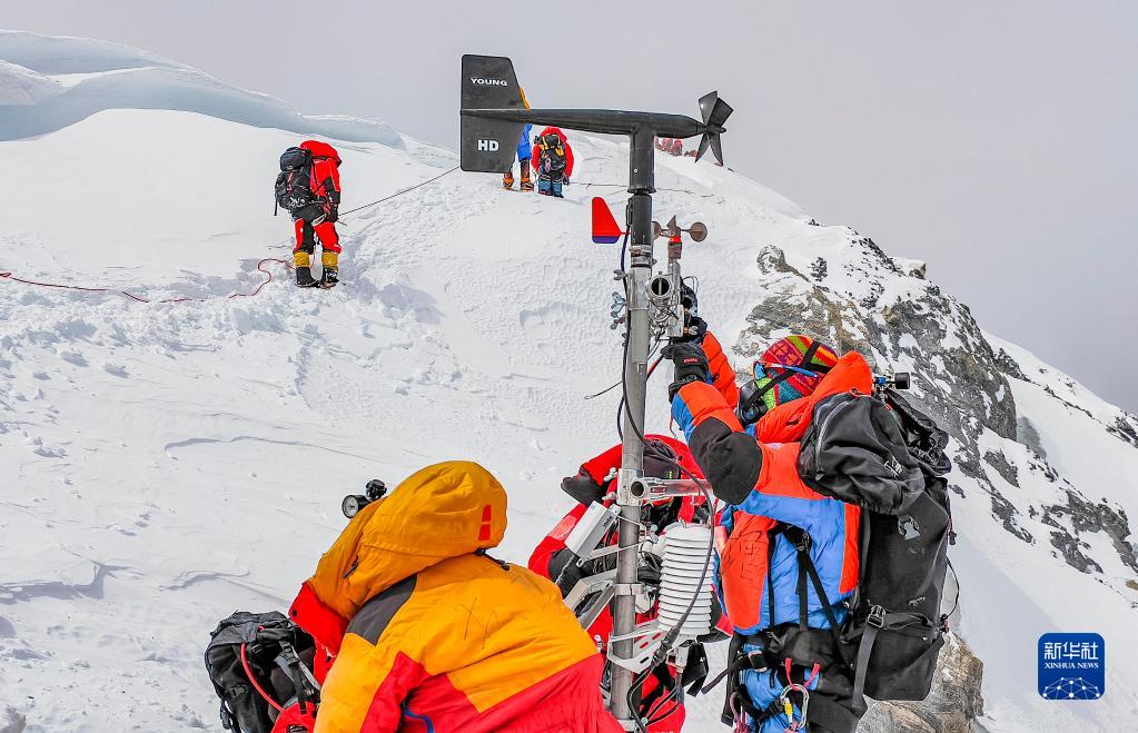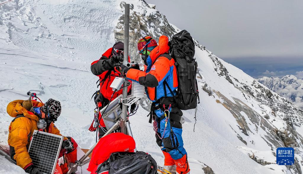 5月23日,科考登顶队员在珠峰海拔约8830米处维护升级自动气象站。新华社
