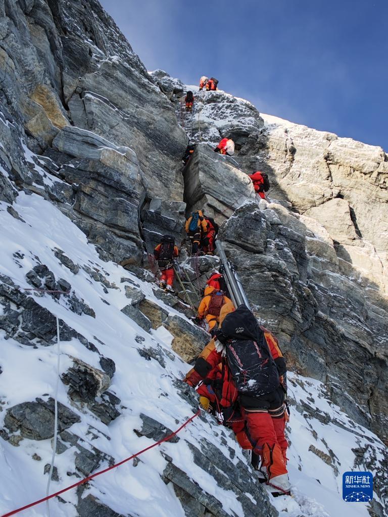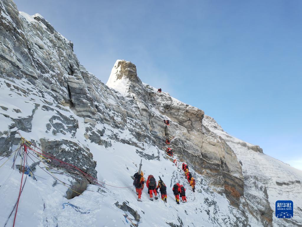 5月23日,2023年珠峰科考登顶队员在冲顶。新华社