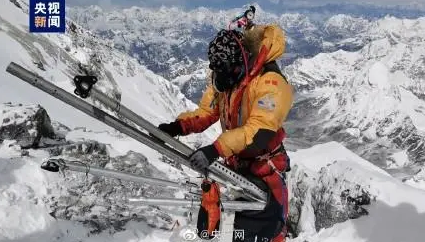 5月23日,科考登顶队员在珠峰海拔约8830米处维护升级自动气象站。
