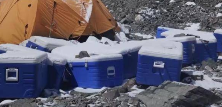 在2023“巅峰使命”珠峰科考中,有一支科考队伍,他们坚守在海拔6530米的冰芯钻取点,面临着狂风、极寒、极度缺氧的恶劣天气,到5月19日凌晨第二支透底冰芯被成功钻取出来,这也是珠峰地区钻取的第五根透底冰芯。图为蓝色的箱子装的是冰芯。大陆央视新闻
