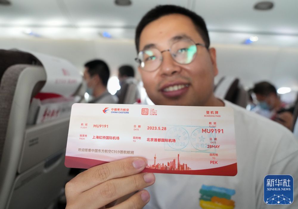 旅客在飞机上展示C919首个商业航班东航MU9191的“纪念登机牌”。新华社