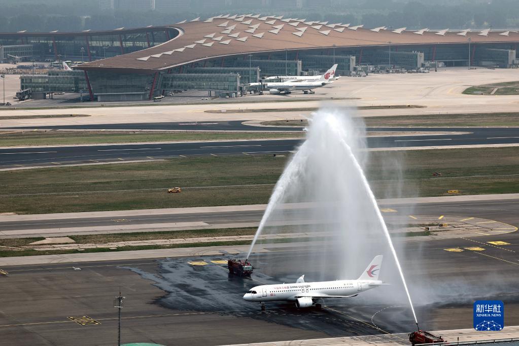 5月28日,北京首都国际机场以水门礼迎接C919首个商业航班东航MU9191。新华社