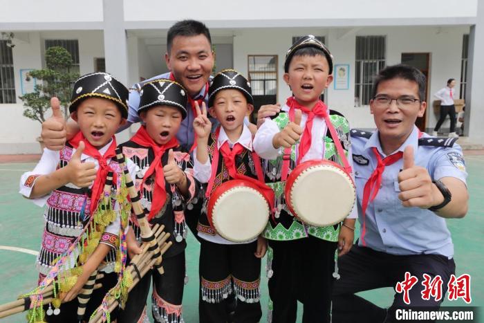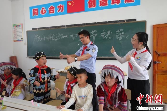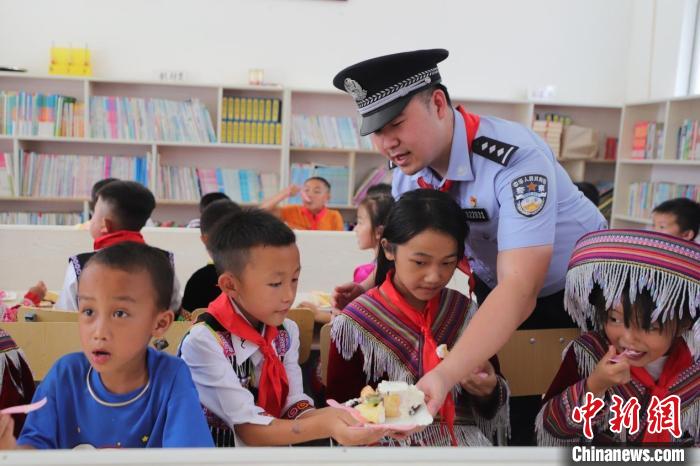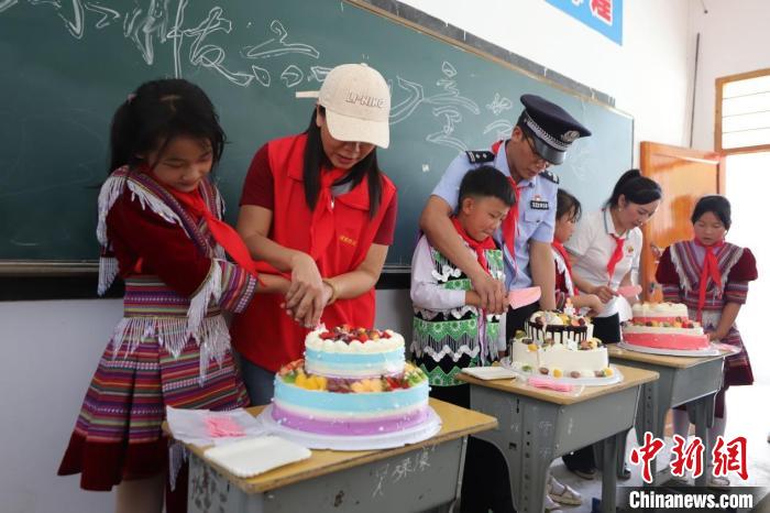近日,广西出入境边防检查总站龙邦出入境边防检查站携手靖西市融媒体中心、靖西市义工协会,到靖西市龙邦镇大莫村弄关民族小学,为边境留守儿童送上节日的祝福。学校师生亲手为民警和志愿者们系上红领巾,民警与小朋友们互动游戏、切蛋糕,共同度过一个难忘的节日。图为民警与孩子们分享爱心蛋糕。中新网