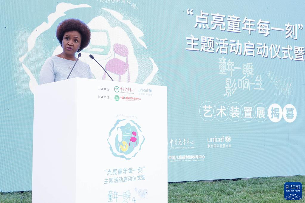 5月31日,由中国儿童中心与联合国儿童基金会驻华办事处联合主办,中国儿童福利和收养中心协办的“点亮童年每一刻”主题活动在北京正式启动。作为主题活动的一部分,《童年一瞬 影响一生》艺术装置展在中国儿童中心拉开帷幕。图为当日,联合国儿童基金会驻华代表桑爱玲在活动上致辞。新华社