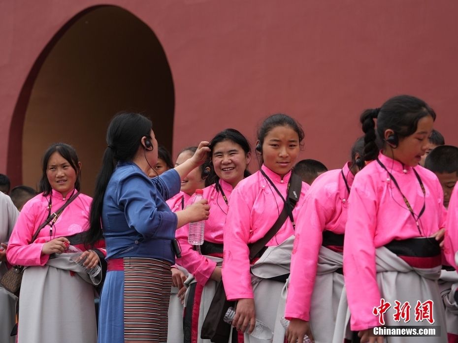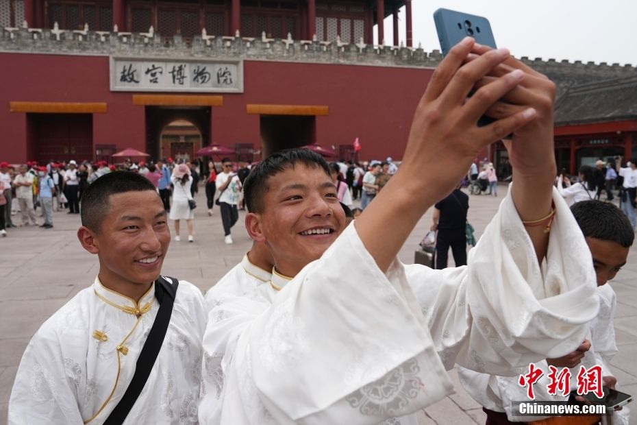 同为14岁的代增扎西(左)与乃美才仁(中)在故宫门前自拍留念。中新网