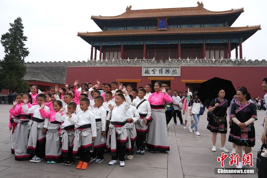 孩子们在故宫神武门外合影吸引了一旁来自广西的仫佬族游客的关注。中新网