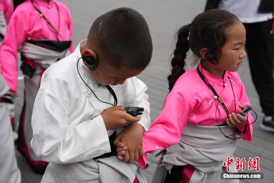 8岁的美德英(左)第一次戴耳机,他十分喜欢手中的这个讲解用的小机器。在故宫游览时,他不时就会低头摆弄它。中新网