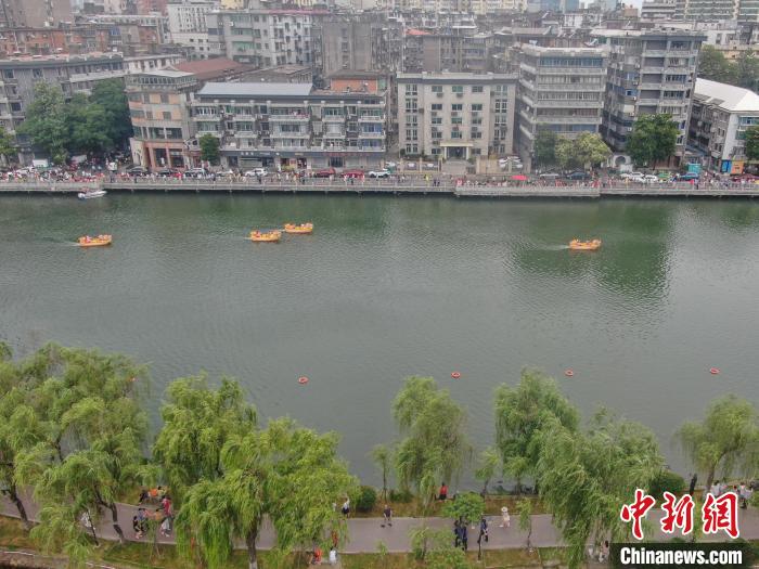 航拍比赛现场,不少市民在岸边观看比赛。中新网