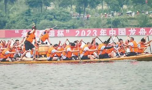 4日,大众组队伍在赛场上奋力拼搏。当天,2023年中国龙舟公开赛(湖南·永州站)在冷水滩区潇湘平湖举行。比赛共分男子组、女子组、大众组三个组别,来自全国各地的31支龙舟队伍挥桨竞渡。《湖南日报》