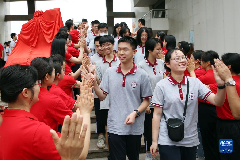 6月7日,中国将拉开2023年高考大幕,一年一度的高考备受人们关注,牵动着万千家庭。连日来,各地学子用多种形式为自己加油鼓劲,社会各界也用自己的行动助力考生顺利应考。图为6月5日,浙江省东阳中学老师们和高三学生击掌,为他们加油鼓劲。新华社