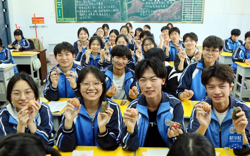 6月5日,河南省洛阳市汝阳县第二高级中学学生收到学校送上的写有高考祝福语的鸡蛋和粽子。新华社