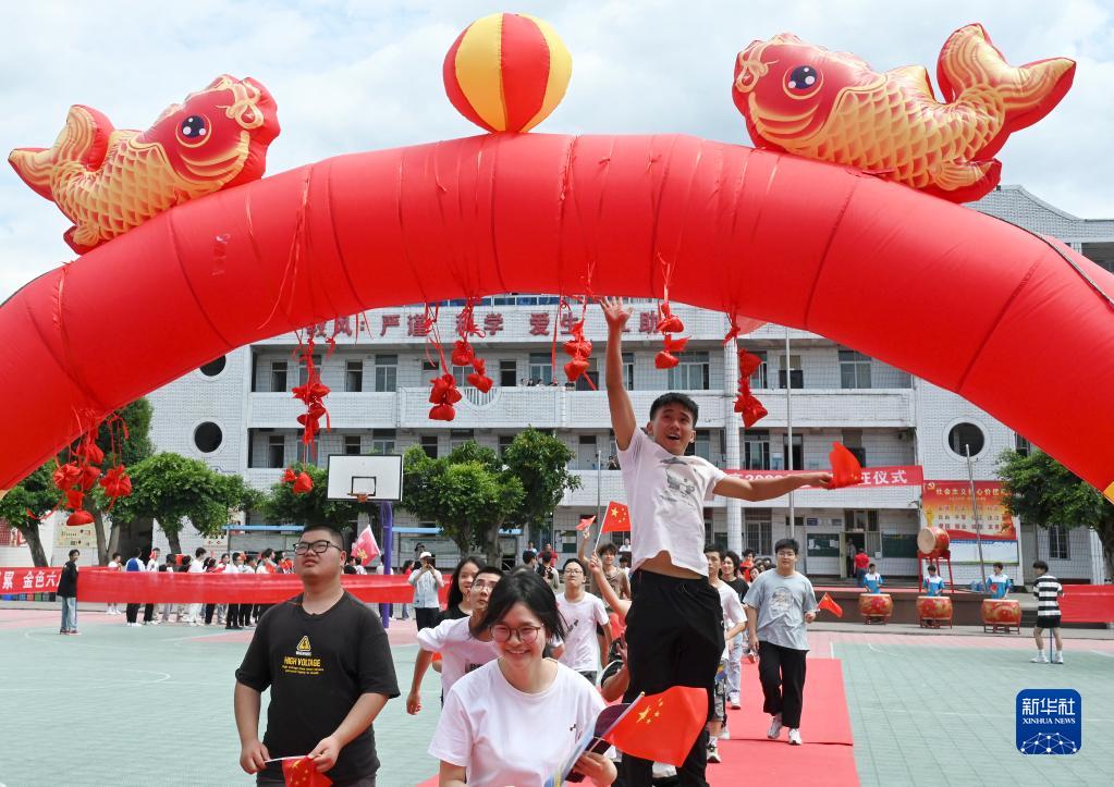 6月5日,四川省内江市第十三中学的高三学生冲过“得胜门”,希望能取得好成绩。新华社