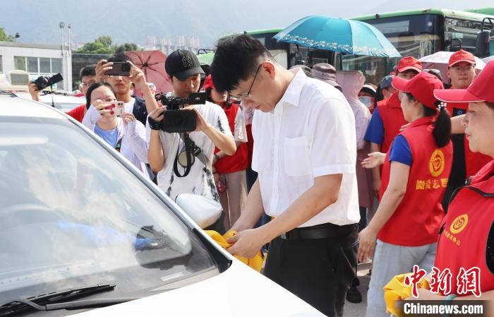 6月5日,“高考爱心直通车 文明实践志愿行”——福建宁德市2023年“爱心送考·橙丝带在行动”大型公益活动启动,1500辆“爱心直通车”将为宁德高考学生送考。图为嘉宾为爱心送考车辆绑活动标识橙丝带。中新网