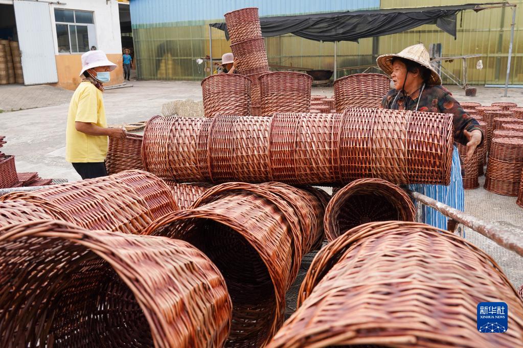 近年来,山东临沭县大力发展柳编产业,逐步形成了从种植、编织到销售的完整产业链。目前全县有柳编工艺品企业400余家,近十万人参与柳编产业,2022年实现产值40亿元人民币,这项已经纳入中国国家级非遗的技艺如今也得到了更好的传承。图为6月6日,临沂金柳工艺品有限公司员工在晾晒柳编产品。新华社