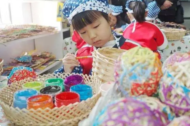 柳编技艺如今已经传递到当地小学和幼儿园孩子们手上。图为临沭县第五实验小学和幼儿园中,孩子们在课堂上学习临沭柳编技法。《齐鲁晚报》齐鲁壹点
